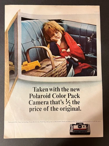 Polaroid Color Pack Camera 1965 Print Ad, Sleeping Child in back seat of car