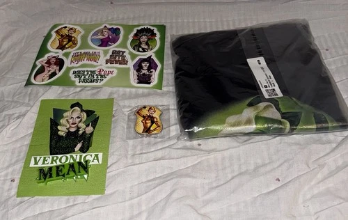 VERONICA GREEN OFFICIAL DRAG MERCHANDISE BUNDLE PIN BADGES STICKERS AND T-SHIRT