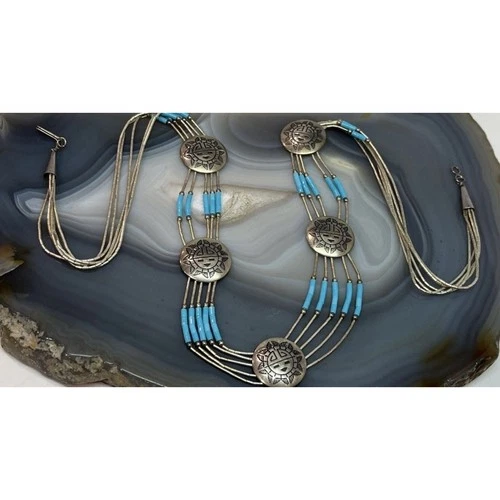 Vtg Sterling 925 Zuni Sunface Kachina 5 Pendant Multi Strand Turquoise Necklace