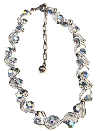 1950s Aurora Borealis Rhinestone Silver Plated Antique Necklace