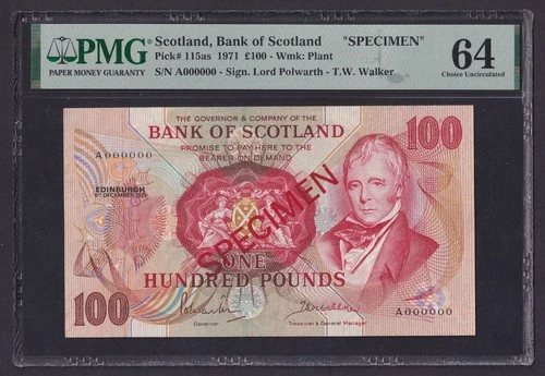 Bank of Scotland 1971 £100 Wmk Plant, S/N A00000 Signed By Lord Polwarth, PMG 64
