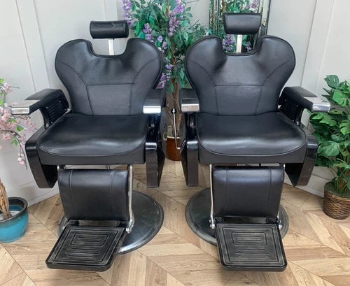 PAIR OF VINTAGE CHROME & BLACK VINYL RETRO BARBER'S HAIR SALON CHAIRS WE DELIVER