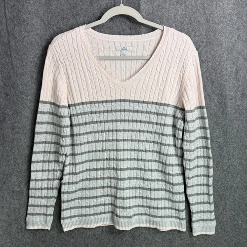 Croft & Barrow Women's L Pink Gray Striped Cable Knit V-Neck Sweater Cotton