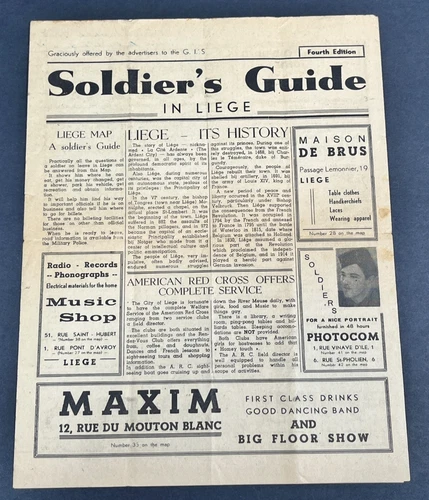 WW2 Liege Belgium Soldiers GI US Army Guide Map Bars Cafes Nightclubs Girls 1945