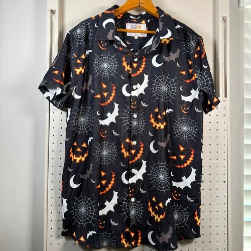 Arvihill Button Up T-Shirt Men's Medium Black Pumpkin Bat Spider Print Halloween