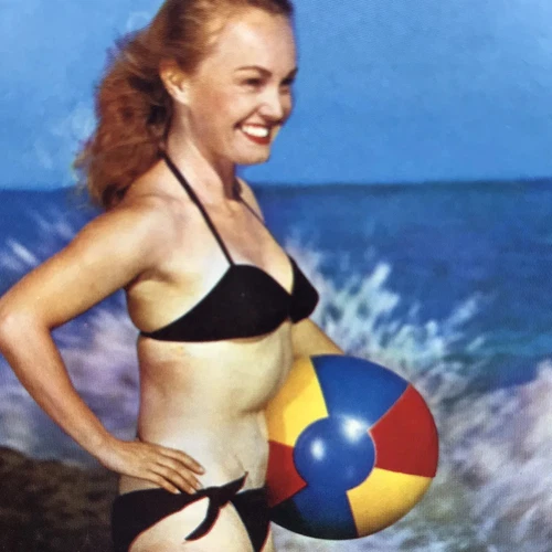 Beach Ball Woman 1950s Vintage Postcard Summer Fashion Black Bikini Redhead 50s