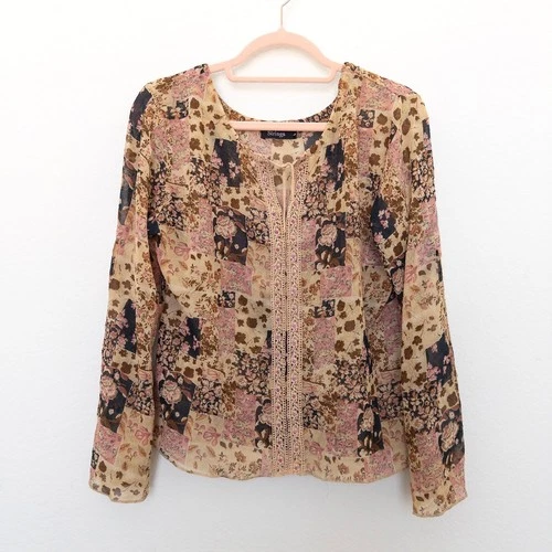 Y2K Strings Womens Blouse Size L Multicolor Patchwork Boho Sheer Beaded Peasant