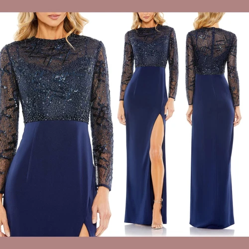 NWT $598 Mac Duggal [ 12 ] Embellished High Neck Bodice Faux Wrap Gown Blue Q730