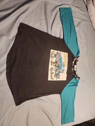 Beautiful " Jesus Take The Wheel" Shirt Cow Print Collar Teal Sleeve Black Shirt