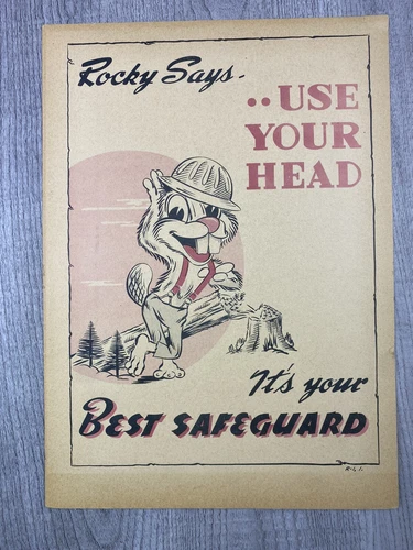 ROCKY SAYS USE YOUR HEAD LOGGING SAFETY PAPER SIGN 14 X 10 BEAVER WITH HARD HAT