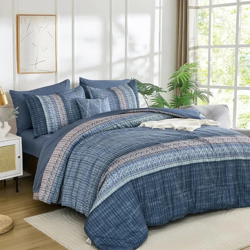 Comforter Set King Size 7 Piece Bed in a Bag Boho Blue Striped Bedding Set Soft