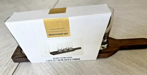 Beer Flight Set 4 Tasting Glasses 5.68oz Each with Paddle Modern Expressions New