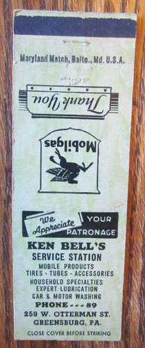 KEN BELL MOBIL GAS STATION MATCHBOOK MATCHCOVER: GREENSBURG, PENNSYLVANIA -E15