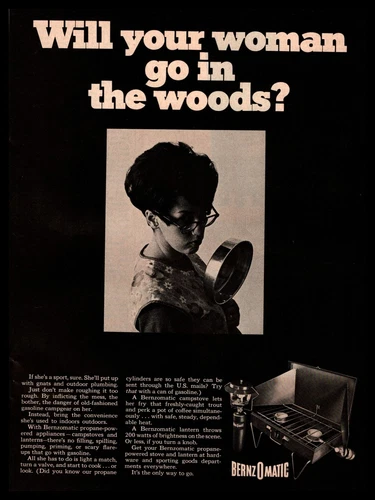 1968 Bernzomatic Camping Stove Will Your Woman Go In the Woods? Vintage Print Ad