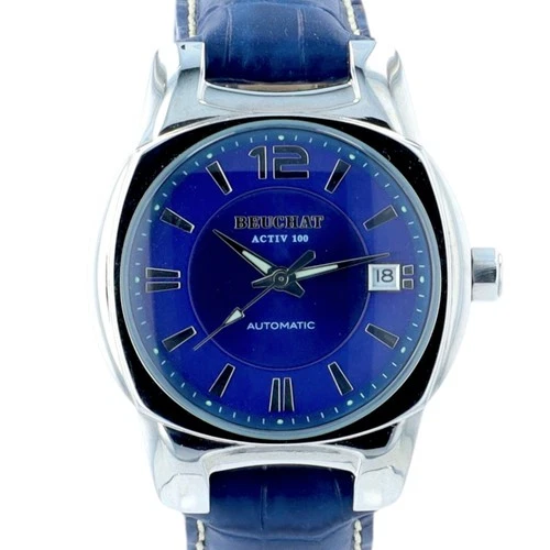 Beuchat Activ 100 Automatic Mens Watch Blue Dial Swiss Steel Date Leather Strap