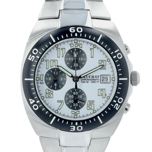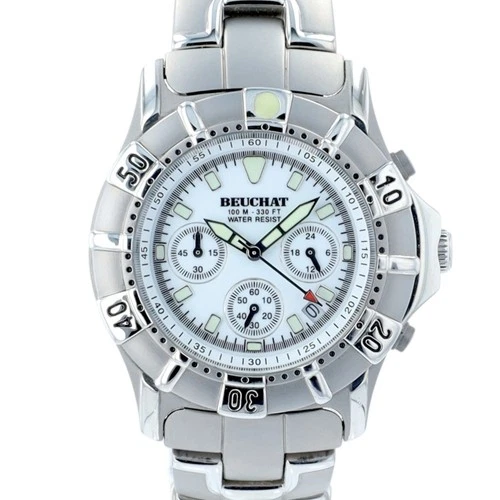 Beuchat Mens Chronograph Watch White Dial Swiss Steel 100M Diver Quartz Date