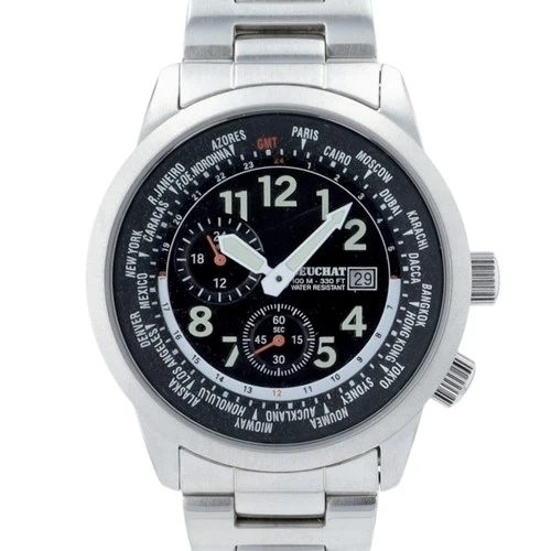 Beuchat World Time Chronograph Mens Watch Swiss Steel GMT Black Dial Quartz