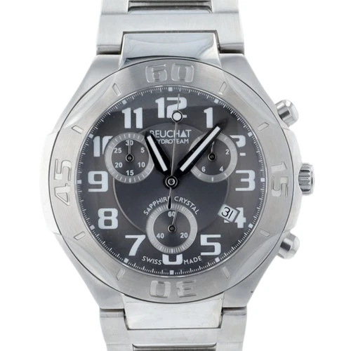 Beuchat Hydroteam Mens Chronograph Watch Swiss Steel Grey Dial Sapphire Quartz