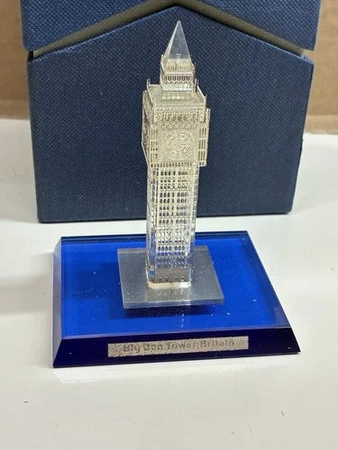 Crystal & Silver Paperweight Big Ben Tower Britain with Blue Glass Base C46