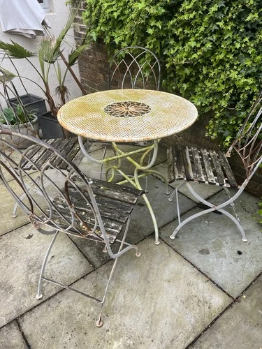 This Vintage French Outdoor Patio Bistro Set Round Metal Table & 4 Chairs