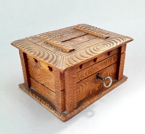 LOVELY ANTIQUE BLACK FOREST HANDCARVED WOOD/TREEN MONEY BOX OR BANK WITH KEY