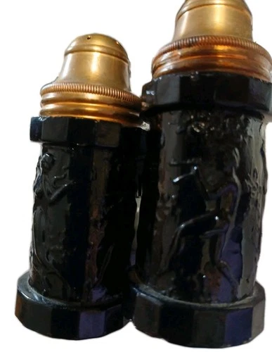 Antique Pressed Black Glass Salt & Pepper Shakers Irish Fairy Folk Fairies 1880s