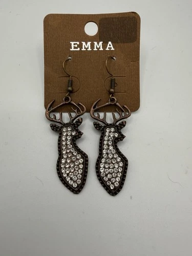 Rhinestone Deer Head Dangle Earrings Copper Tone Western Buck Bling