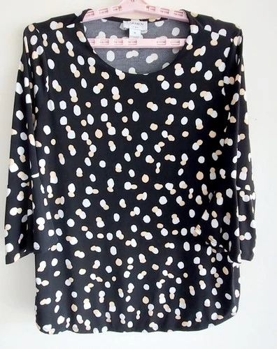 CARMEN Womens 1X Black Print Knit Pullover Blouse w/White and Peach Spots
