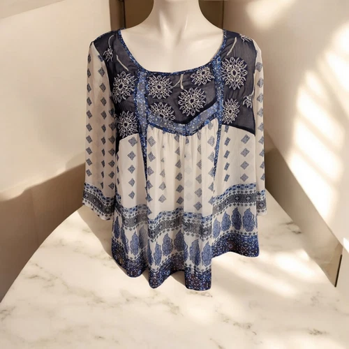 V Cristina Sheer Paisley Embroidered Peasant Top Womens M