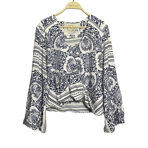 Blue Life Blouse Women Size S Boho Hippie Retro Wide Flare Draped Gypsy Relaxed