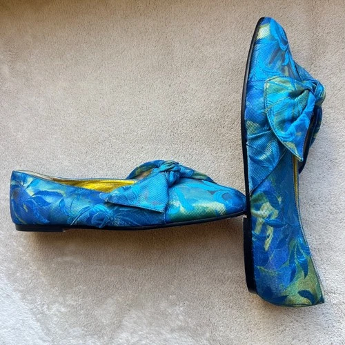 Mondi Accessoires Women 8 Blue Leaf Print Bow Square Point Toe Flats Designer