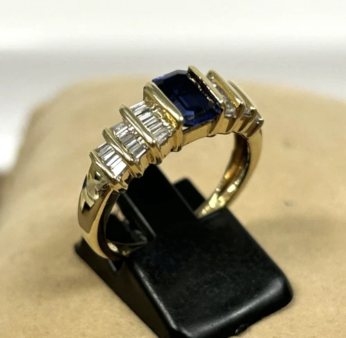 14K YELLOW GOLD EMERALD-CUT BLUE TOPAZ & 3/4 CT TW BAGUETTE DIAMOND RING SZ 8.5