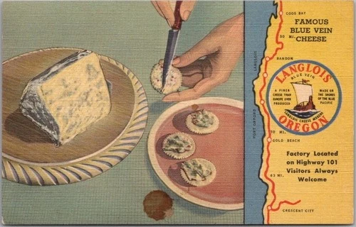 Langlois, Oregon Advertising Postcard "FAMOUS BLUE VEIN CHEESE" Curteich Linen