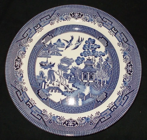 VINTAGE CHURCHILL BLUE & WHITE WILLOW PATTERN DINNER PLATE IN GOOD CONDITION