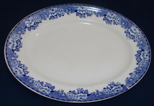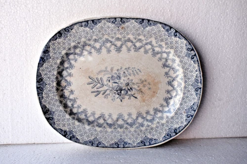 Antique Blue Transferware Oval Plate Floral Pattern Victorian Ironstone 9.5in "R