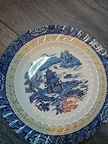 Vintage 1960s Royal Tudor Chinese Garden 9¼" Plate Blue On White, Gold Ruff. VGC