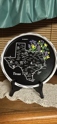Vintage Texas souvenir bar round metal tray cities, landmarks, bluebonnets 11”