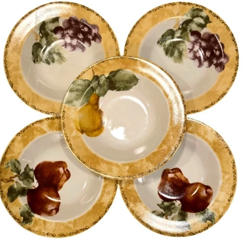 Vintage CHERI BLUM 9" Soup Bowls 222 fifth Cortland x5 FRUIT grapes apples pear