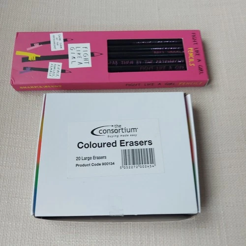 SHARP & BLUNT 'Fight Like A Girl' HB Pencils +20 Box Large Multi-Colour Erasers