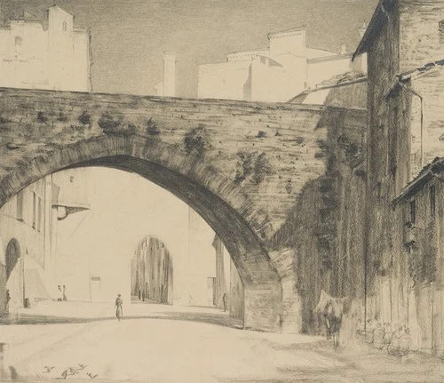 C. WALTHER (1880-1956), Italian City with Bridge Arch, Coal Realism