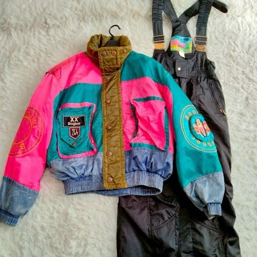 Vtg 90s BOGNER Ski Suit Unisex L Set Up Denim Print Retro Pink Teal Jacket Pants