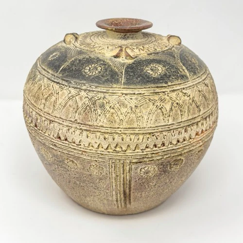 Vintage Carved Pottery Lug Vase Tribal Style Boho Global Decor Vessel