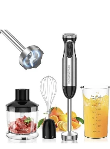 Bonsenkitchen Stainless Steel Hand Blender 4-in-1, 1000W Chopper & Whisk– Black