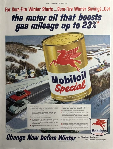 1954 Mobiloil Special Boost Gas Mileage Horse Dealers Garage Winter VTG Print Ad