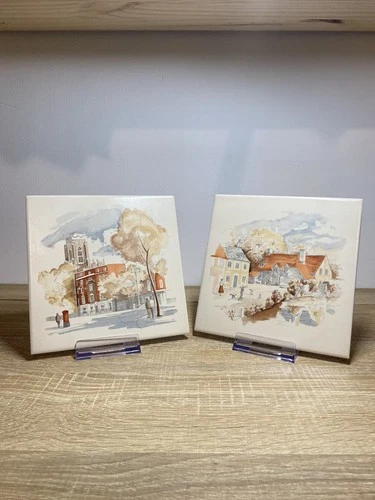 Set of 2 Vintage Italian Ceramic Tiles Village Scene 816 Mid Century Decor
