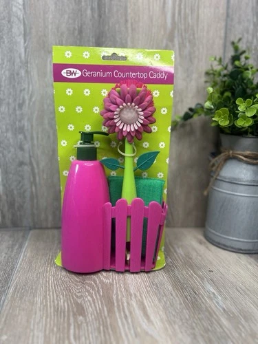 Geranium Countertop Caddy Set Pink Soap Dispenser + Brush + Sponge Kitchen Sink