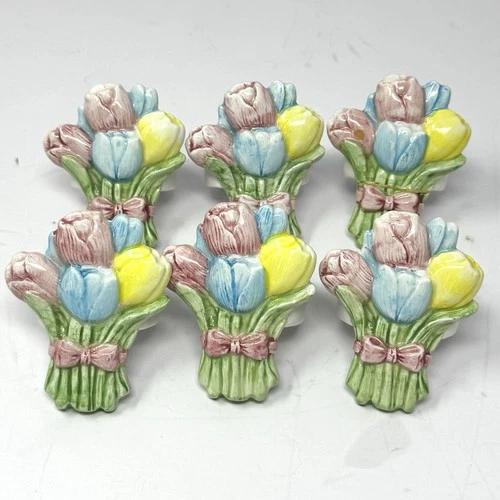 Vintage Audrey Bone China 6 Napkin Ring Holder Tulip Bouquets Spring Easter Read