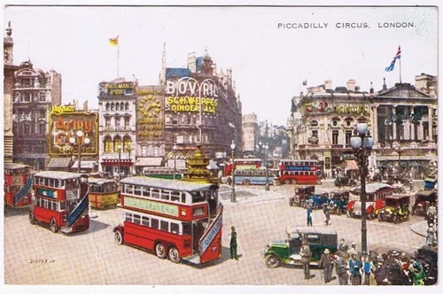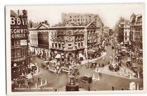 Piccadilly Circus London bustling cars buses Bovril Schweppes Saqui signs RPPC