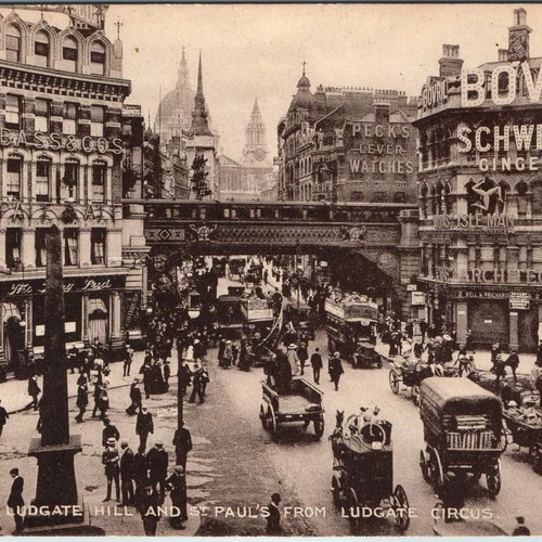 c1910s London Ludgate Hill St Paul Cathedral Bovril Schweppes Advert Bridge Rail