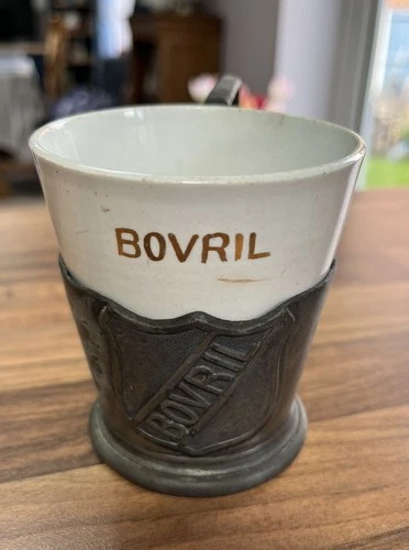 Rare Vintage Embossed Bovril Shield Pewter Metal Drink Holder With Bovril Mug